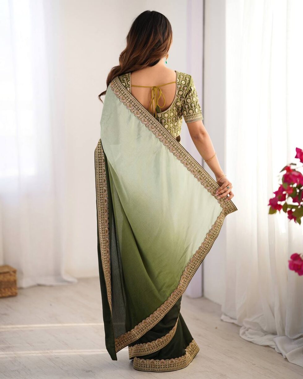 Grace any occasion with this beautiful Chinon Silk saree, exquisitely designed with intricate thread and sequence lace work. The saree boasts a generous 5.5-meter cut and is lightweight at just 0.800 grams. It comes with an unstitched Mono Bangalore blouse featuring matching thread and sequence work, sized at 0.80 CM. This elegant set, perfect for a sophisticated look, is available for βΉ4,399.00.