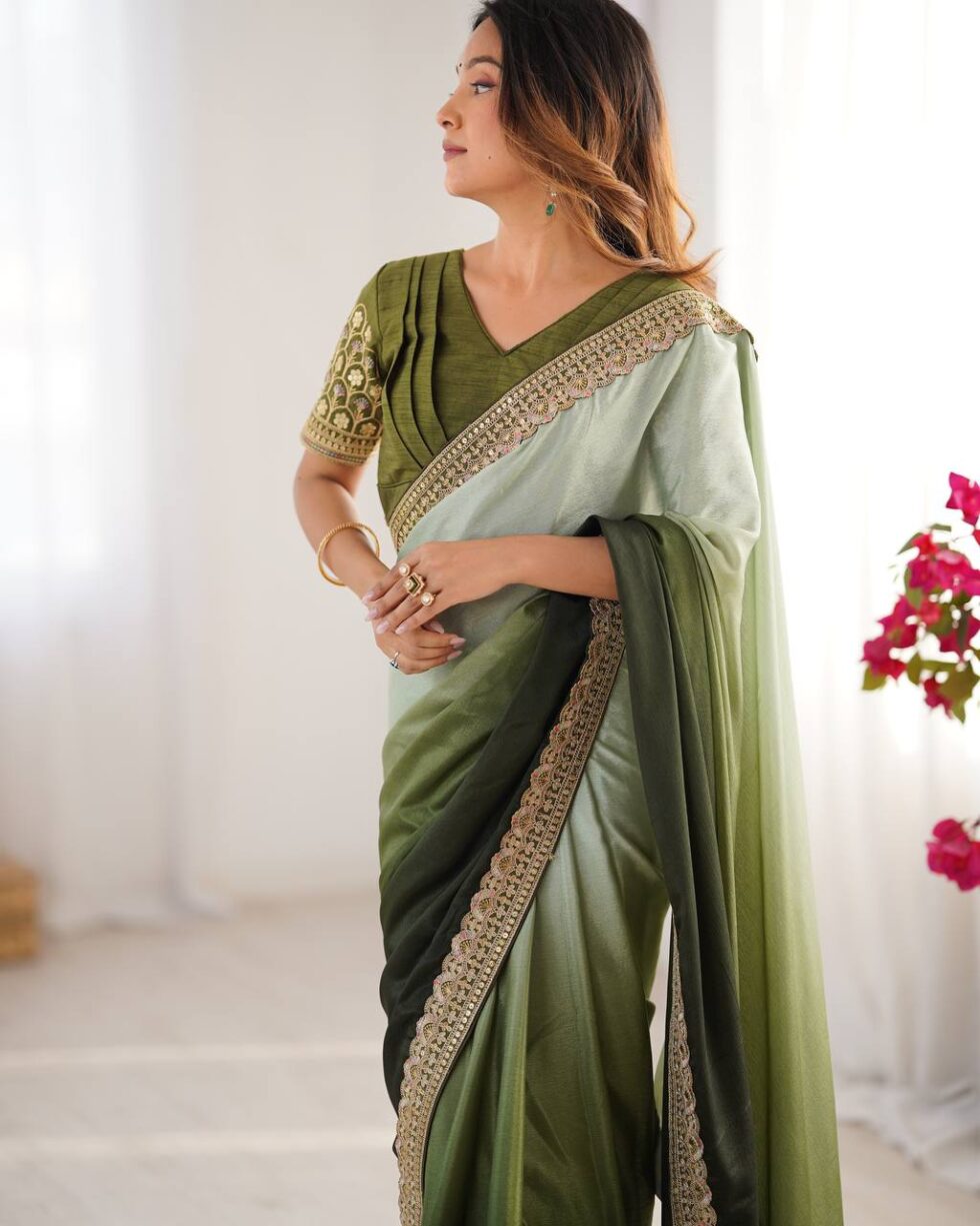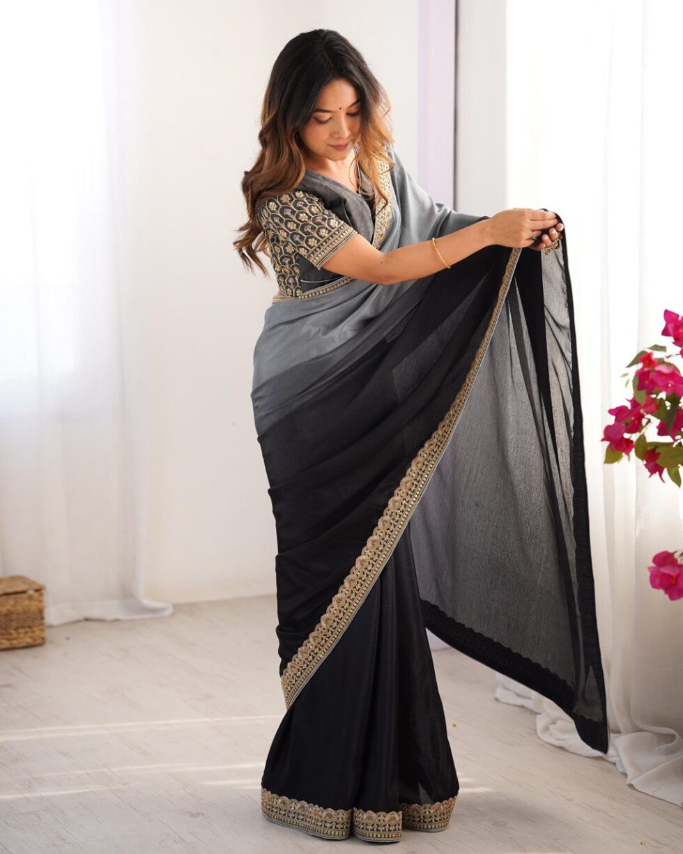 Chinon Silk saree with thread and sequence lace work, 5.5M cut, includes unstitched blouse. Priced at βΉ4,399.00.